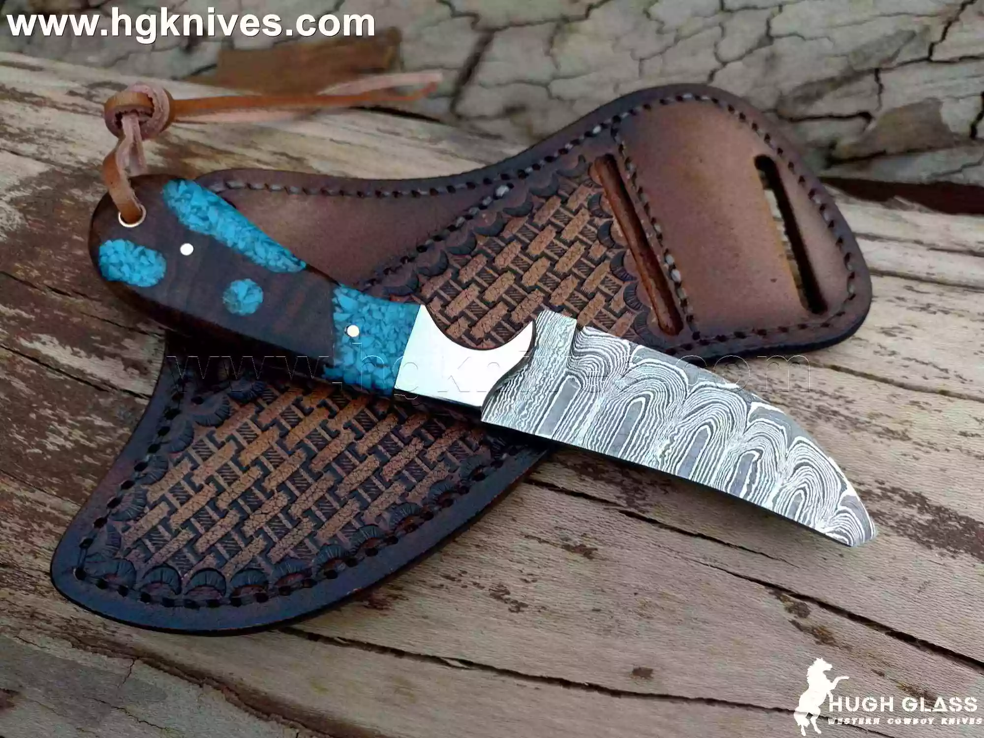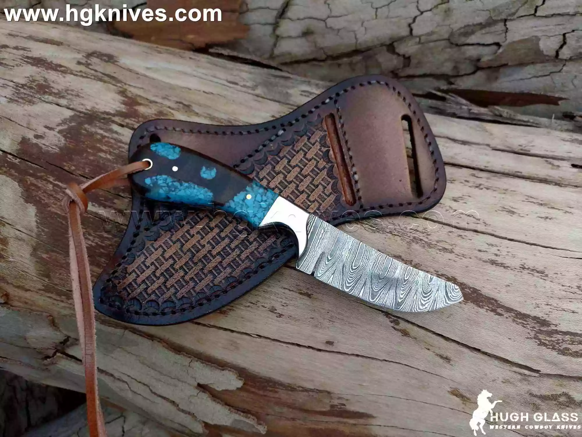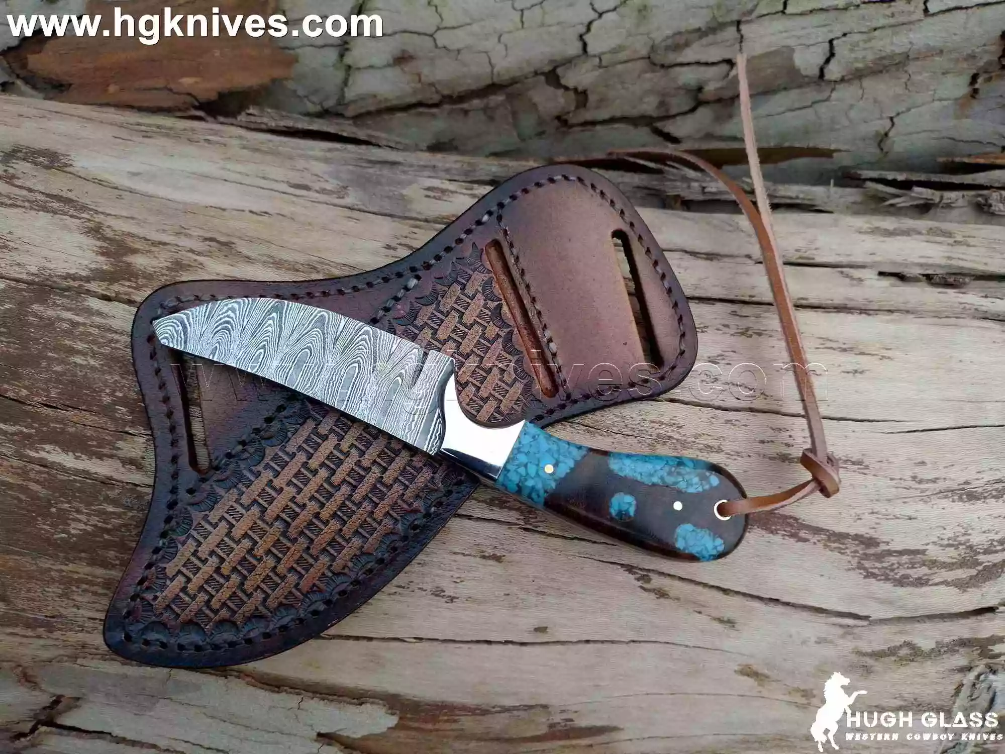 Cowboys Knife Damascus Steel Blade With Custom Pancake Sheath