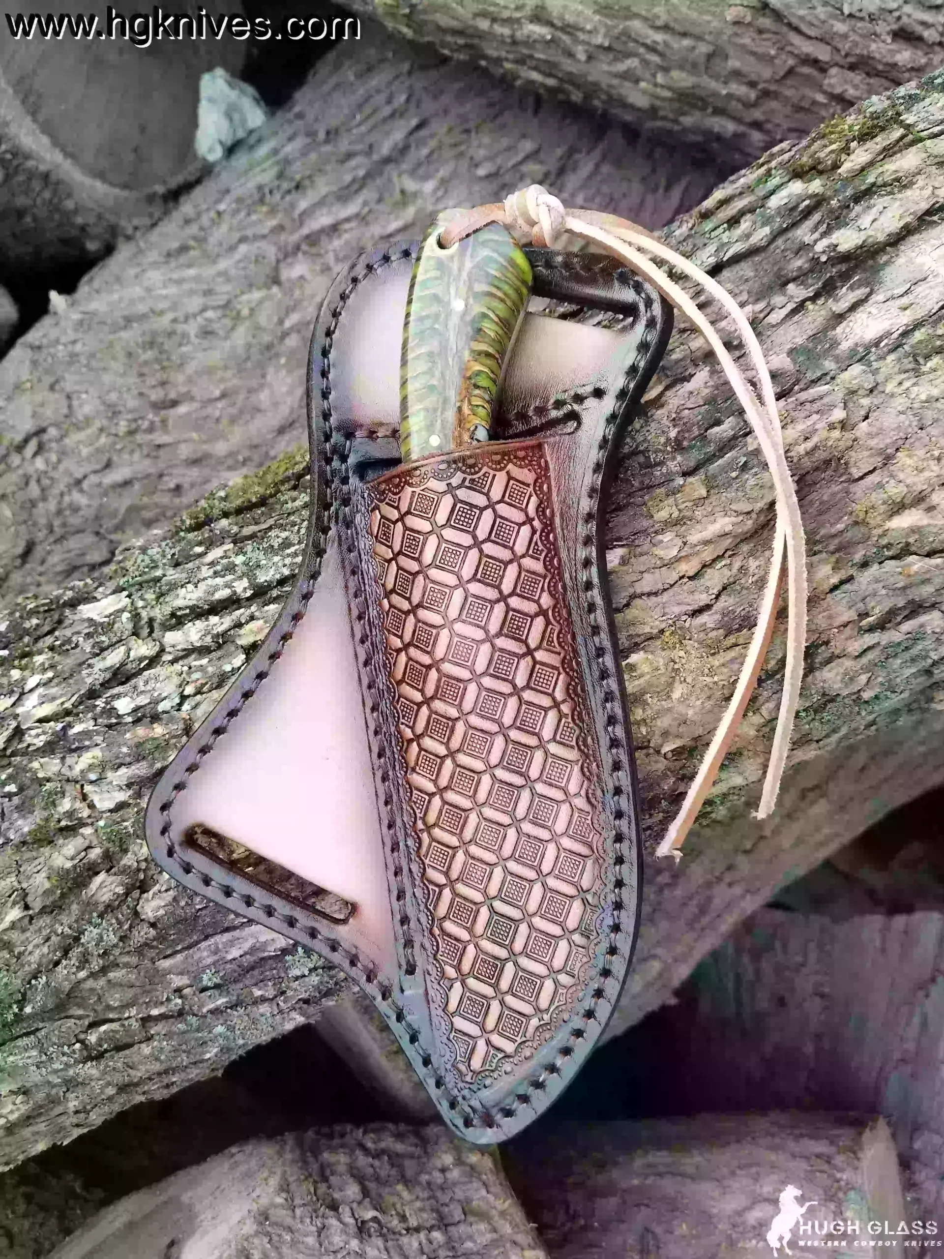 The handle features a stunning pine cone resin handle, providing a secure grip while adding a unique, eye-catching aesthetic. Balanced perfectly at 8.0 inches overall length, this handmade knife feels solid and comfortable in hand. A genuine cowhide leather pancake sheath is included for safe carry and classic Western appeal.